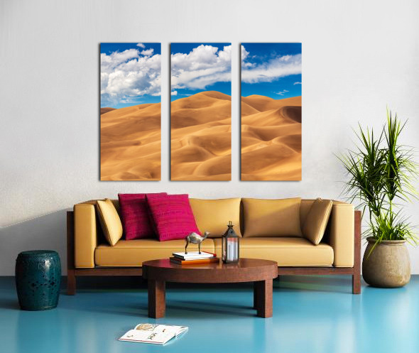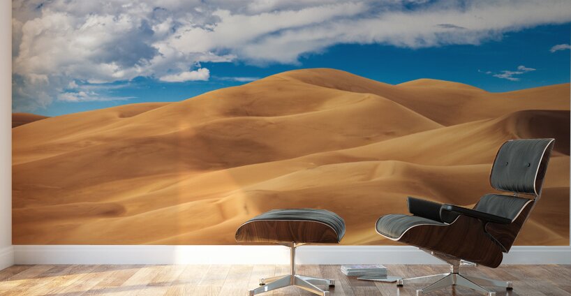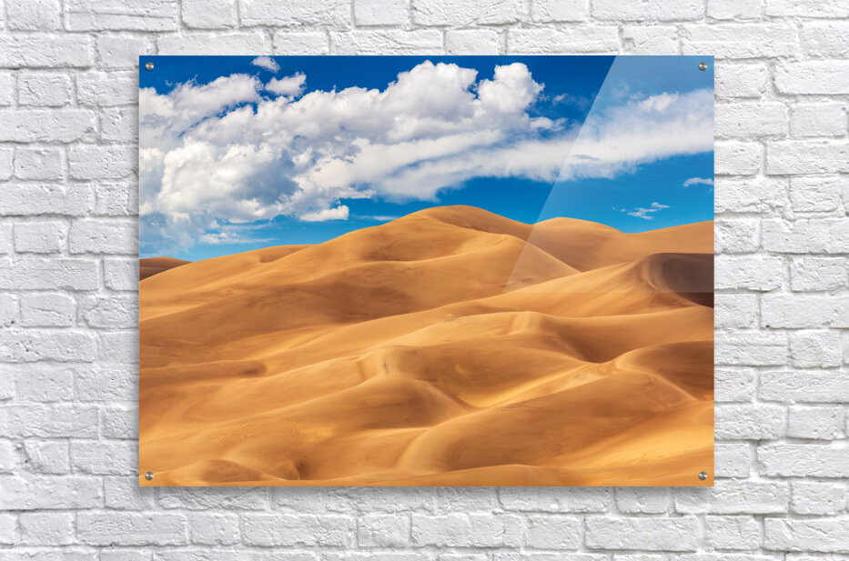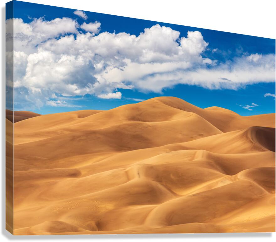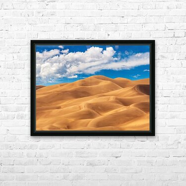 The Great Sand Dunes National Park in Colorado is a stunning landscape of contrasts and curves. I captured this image on a sunny day, when the blue sky and the golden sand created a striking contrast. The dunes are shaped by the wind and the water, forming sensual curves and patterns that invite the eye to explore. I wanted to convey the drama and the beauty of this natural wonder, as well as the sense of awe and wonder that I felt when I was there.