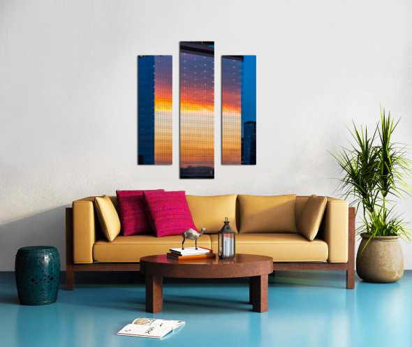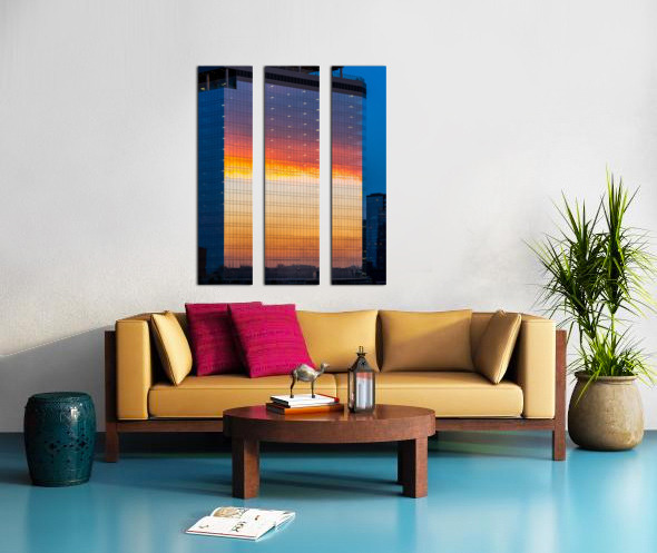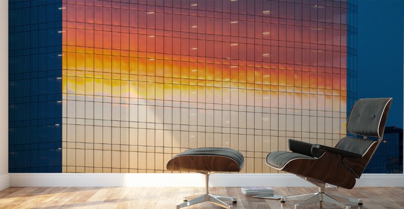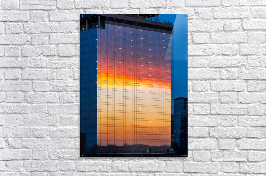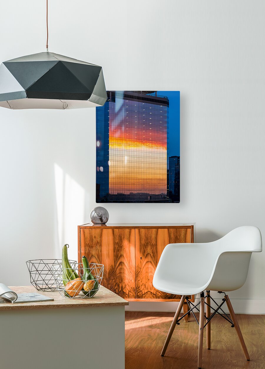 ABOUT THIS ARTWORK: BRILLIANT SUNSET REFLECTED IN THE GLASS OF NEW OFFICE BUILDING
