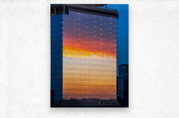 Sunset clouds reflected in glass windows on sixth and guadalupe st office and apartment building in Austin Texas. This stunning photograph captures the mesmerizing reflection of a vibrant sunset on the glass facade of the Sixth and Guadalupe building in Austin, Texas. The building's sleek, modern architecture is accentuated by the grid of reflective windows, which perfectly mirror the brilliant hues of the setting sun. The sky transitions from deep blue at the top to a fiery gradient of orange, yellow, and red, creating a breathtaking visual spectacle. The reflection is so vivid and clear that it almost appears as if the building itself is glowing with the colors of the sunset. The image is further enhanced by the subtle details of the cityscape at the bottom, adding depth and context to the scene. This photograph is not just a simple cityscape; it is a captivating blend of natural beauty and urban sophistication. It would make a striking addition to any art collection, bringing a touch of elegance and a reminder of nature's splendor to any space. The image is a testament to the photographer's skill in capturing the perfect moment, making it a must-have for anyone who appreciates fine art photography.