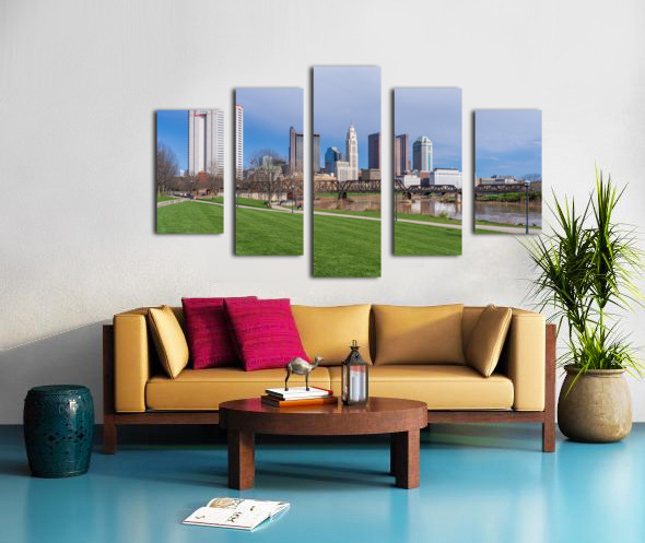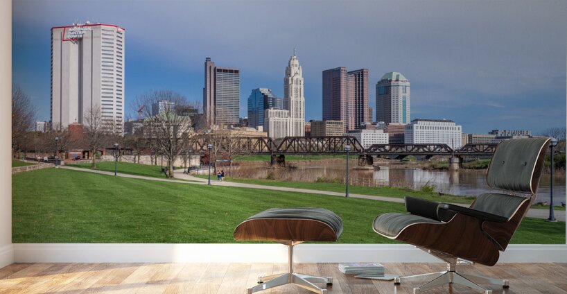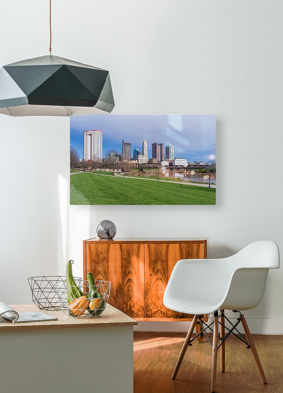 Get this artwork "Columbus Ohio waterfront skyline behind railroad truss bridge" in a framed print.