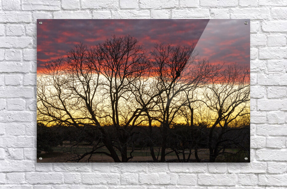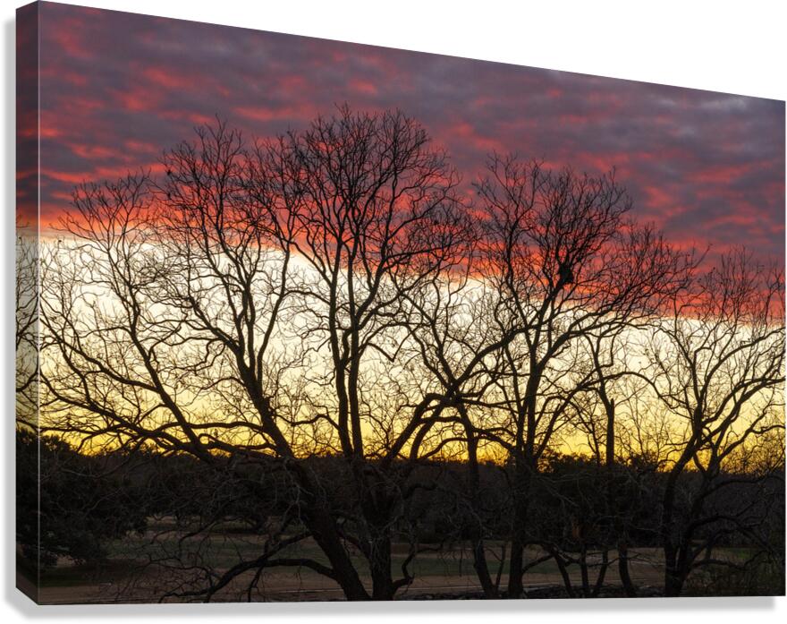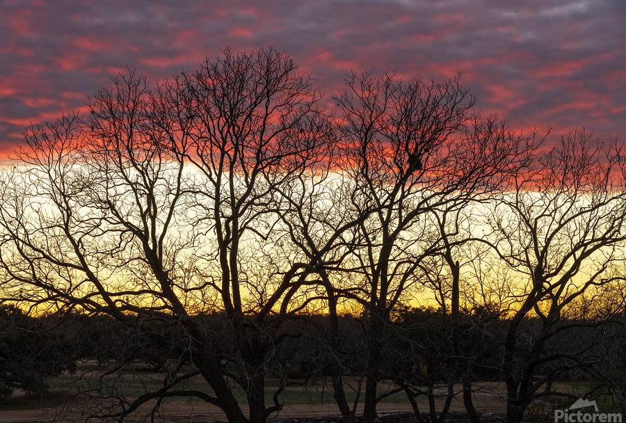Dramatic sunset lighting a layer of clouds and with focus on winter tree branches in Legacy Hills Park near Georgetown Texas