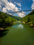 Rafters float towards the rapids under the high arched New River Gorge bridge in West Virginia