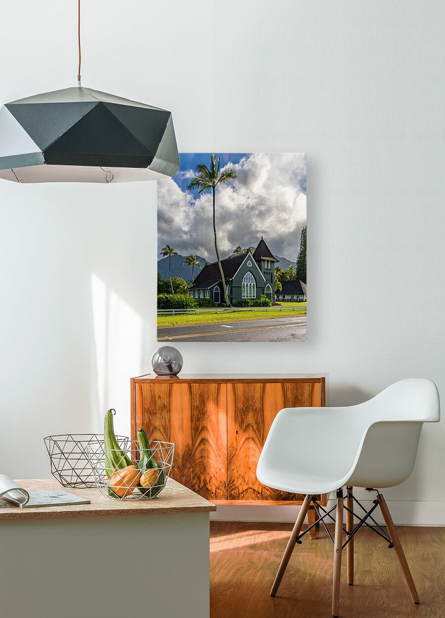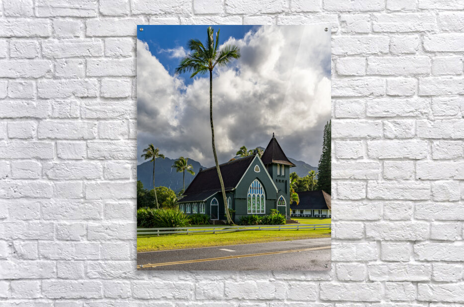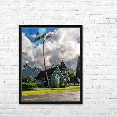 Waioli Huiia Church stands in Hanalei Kauai with waterfalls in Picture Frame Printing