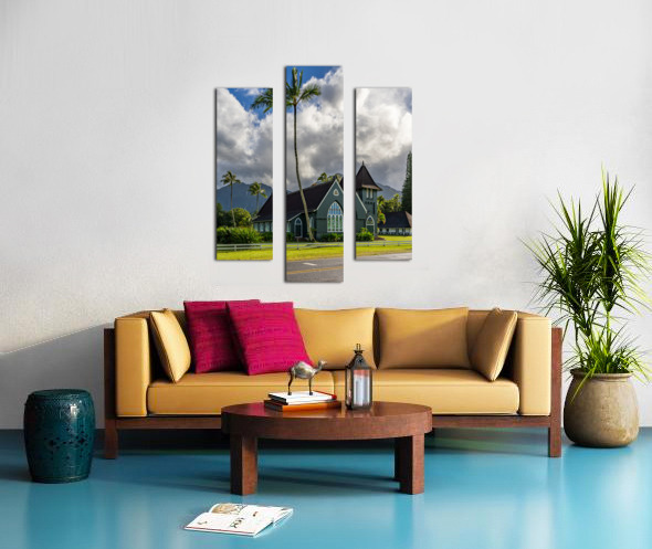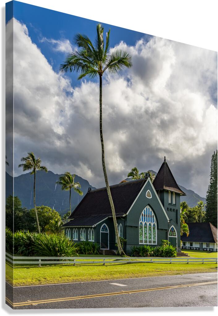 ABOUT THIS ARTWORK: WAIOLI HUIIA CHURCH STANDS IN HANALEI KAUAI WITH WATERFALLS IN