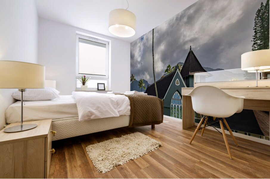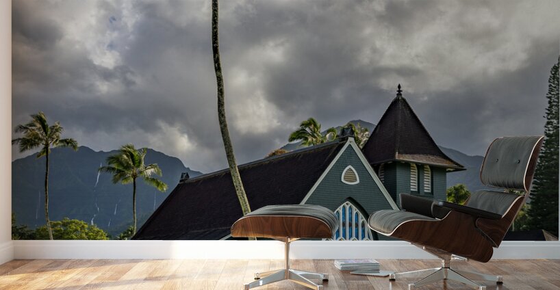 Waioli Huiia Church stands in Hanalei Kauai with waterfalls in  Wood print