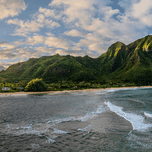 PANORAMA OF TUNNELS BEACH AT SUNSET IN KAUAI HAWAII WITH ST