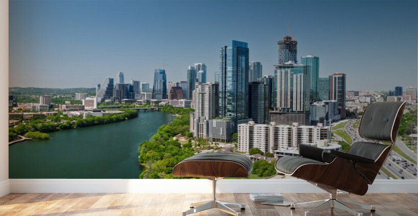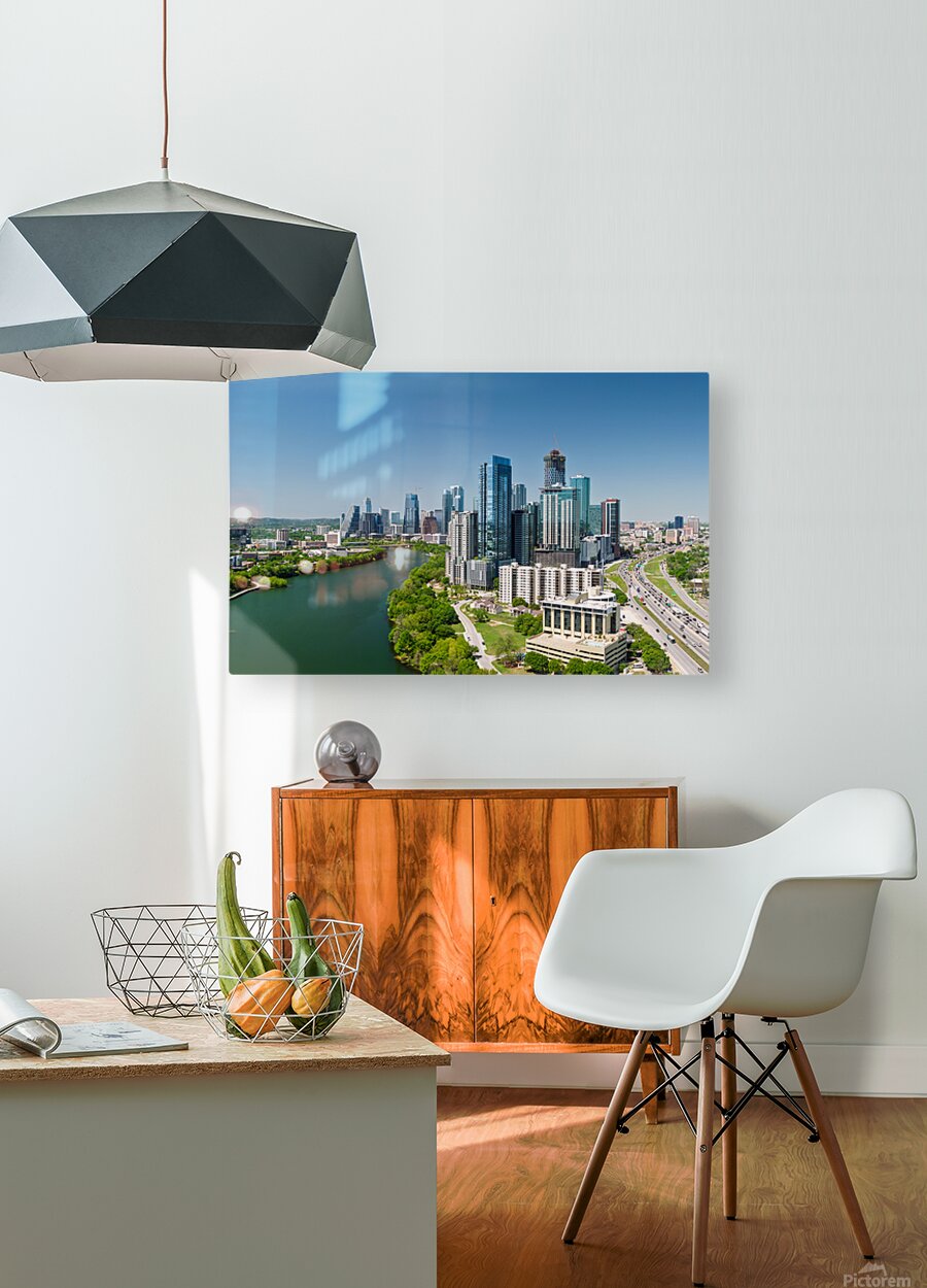 Exclusive fine art photography print ready to hang, capturing aerial panoramic skyline of Austin Texas from the east with I35 in foreground