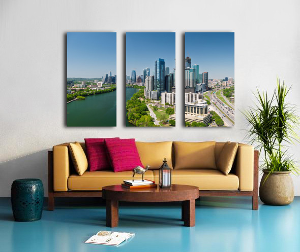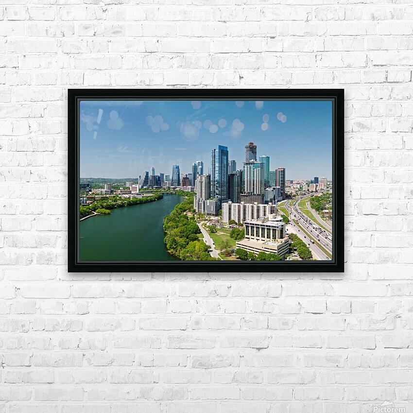 Exclusive fine art photography print ready to hang, capturing aerial panoramic skyline of Austin Texas from the east with I35 in foreground