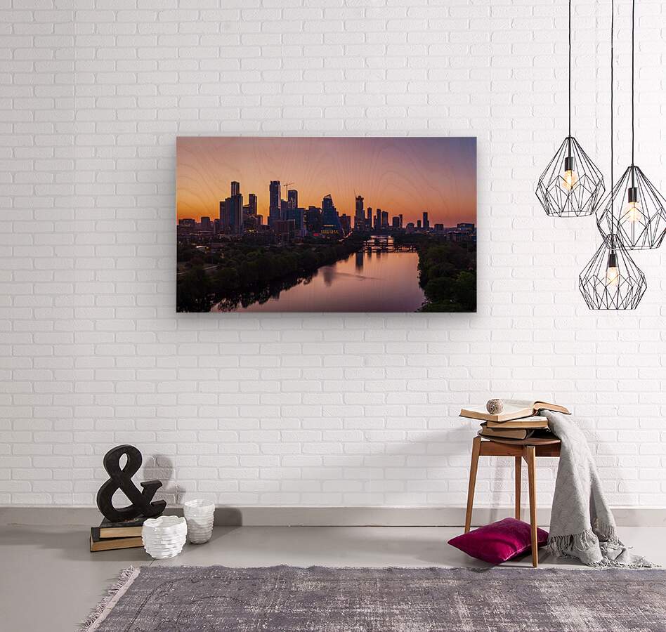 ABOUT THIS ARTWORK: ORANGE SKIES BEHIND SKYLINE OF AUSTIN TEXAS AS SUN STARTS TO RIS