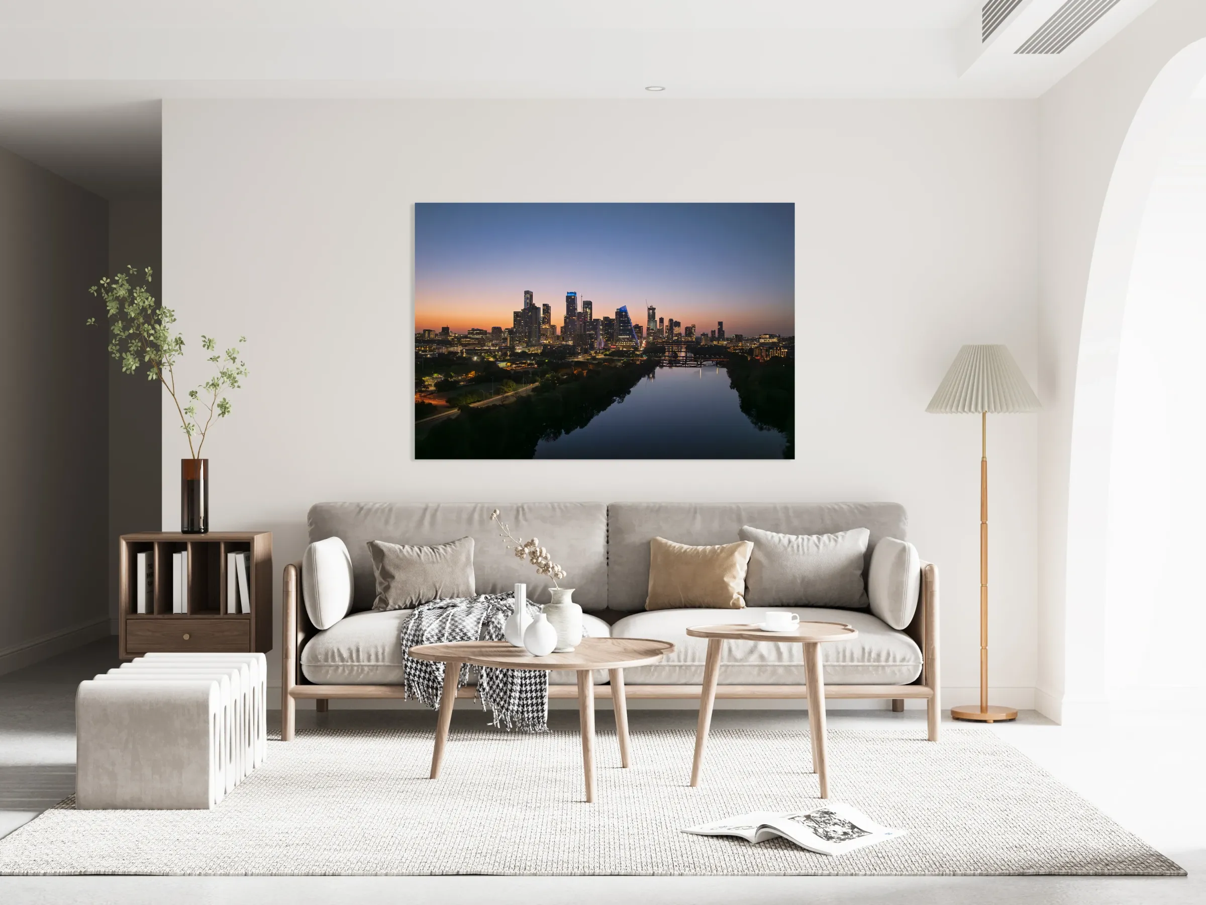 ABOUT THIS ARTWORK: ORANGE SKIES BEHIND SKYLINE OF AUSTIN TEXAS AS SUN STARTS TO RIS