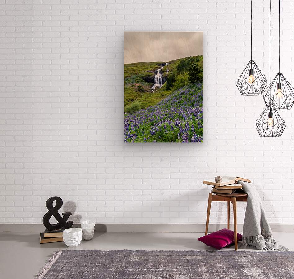 ABOUT THIS ARTWORK: WATERFALL IN TUNHUDALUR VALLEY NEAR ISAFJORDUR ICELAND WITH LUPI
