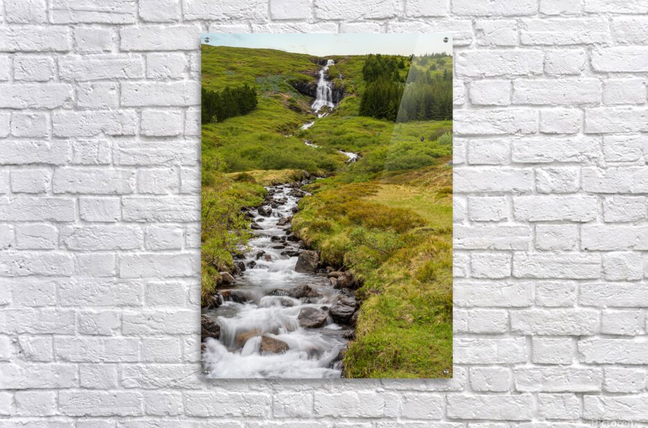 ABOUT THIS ARTWORK: WATERFALL IN TUNHUDALUR VALLEY NEAR ISAFJORDUR ICELAND WITH LUPI