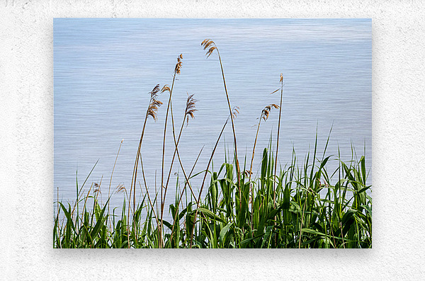 ABOUT THIS ARTWORK: TALL REEDS AND GREEN GRASSES SWAY GENTLY AGAINST A LIGHT BLUE SK