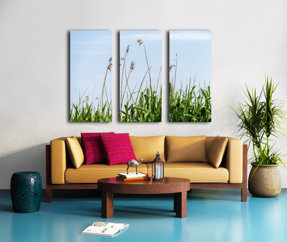 Tall reeds and green grasses sway gently against a light blue sk Canvas print