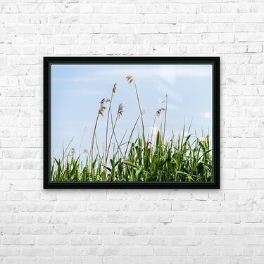 Get this artwork "Tall reeds and green grasses sway gently against a light blue sk" in a framed print.