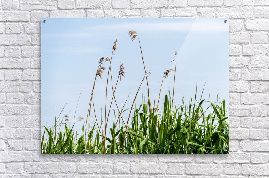 Get this artwork "Tall reeds and green grasses sway gently against a light blue sk" in a framed print.