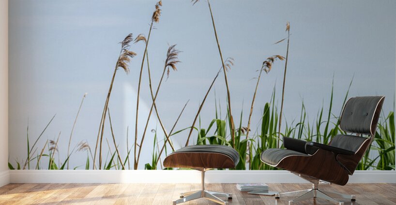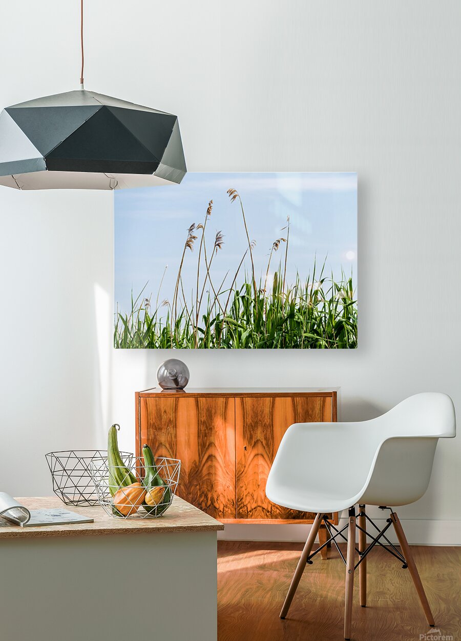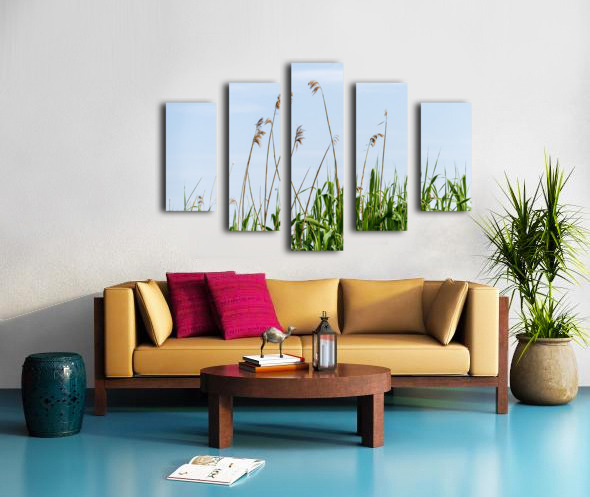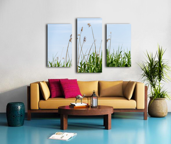 Tall reeds and green grasses sway gently against a light blue sk Canvas print