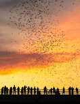 ABOUT THIS ARTWORK: BAT WATCHERS CROWD ON CONGRESS AVENUE BRIDGE WITH BATS