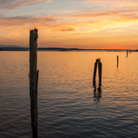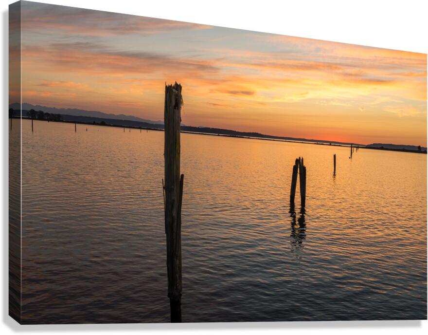 Old wooden posts as leading line to sunset off Everett in Possession Sound Washington State