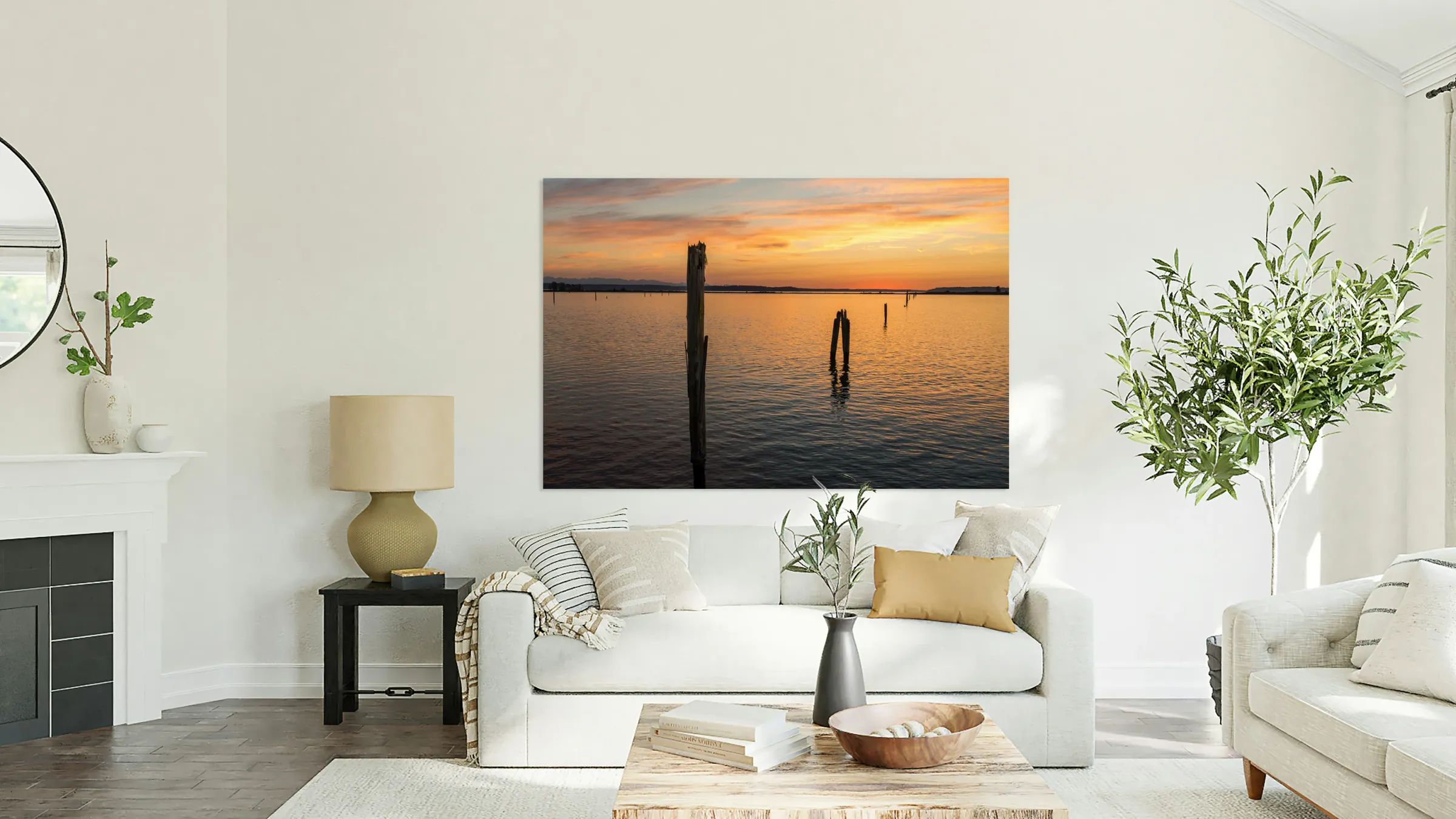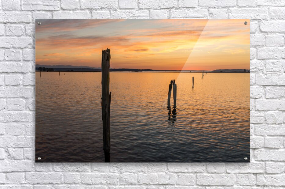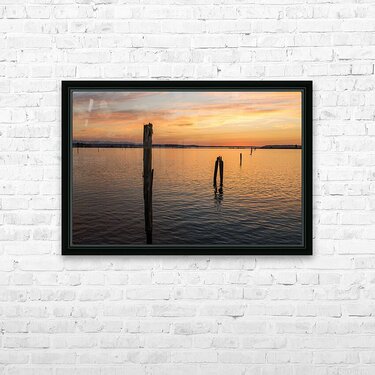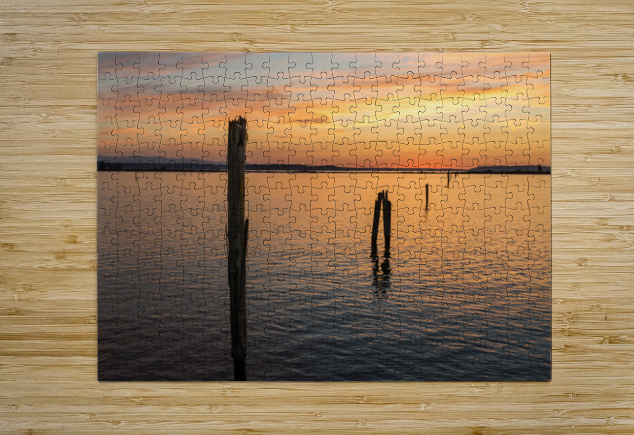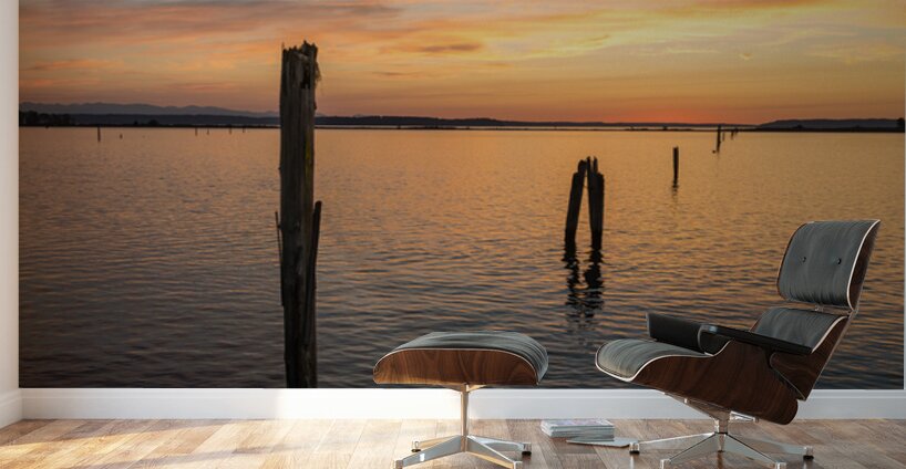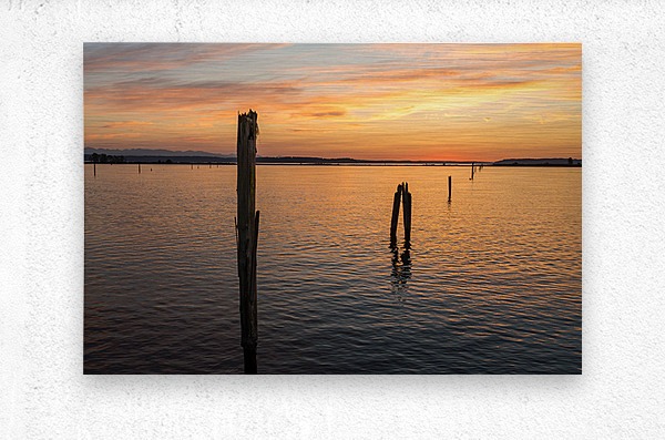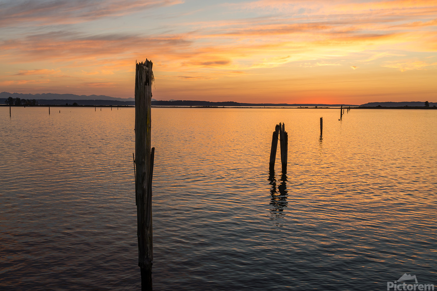 Old wooden posts as leading line to sunset off Everett in Possession Sound Washington State