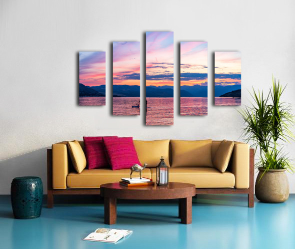 ABOUT THIS ARTWORK: SUNSET OVER LAKE CHELAN WITH SILHOUETTE OF COUPLE PADDLING ON PA