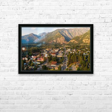 Aerial view of Leavenworth the Bavarian Alpine village in Casca Picture Frame Printing