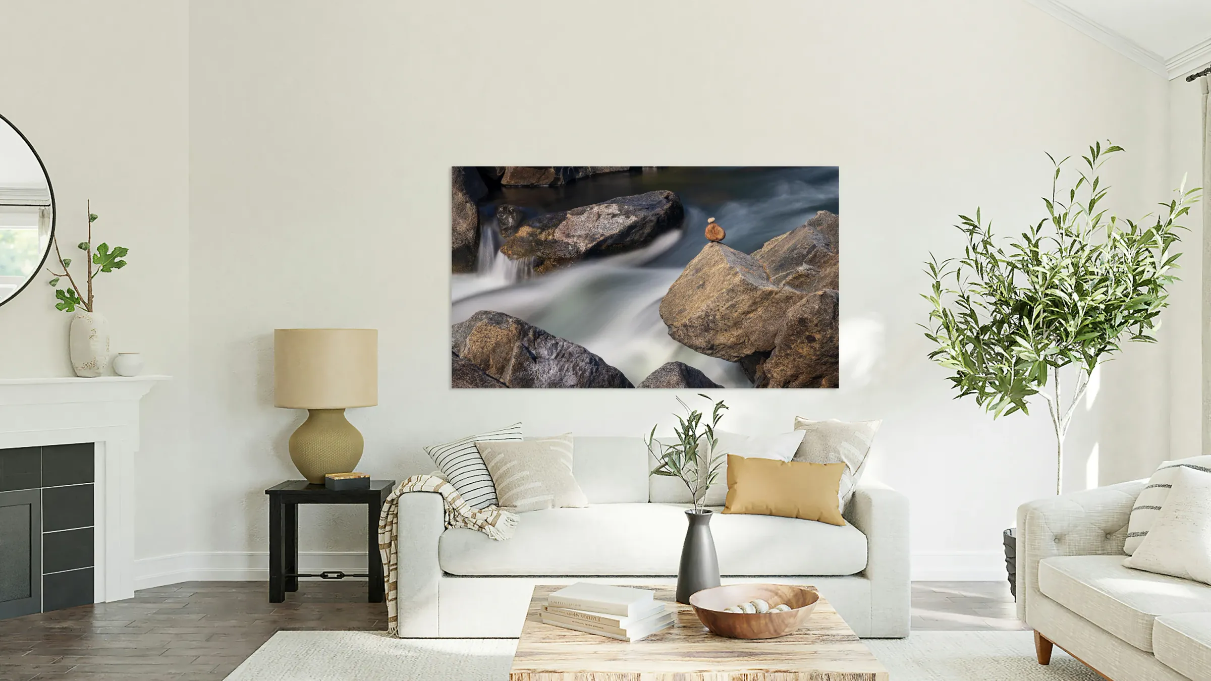 ABOUT THIS ARTWORK: PEBBLES BALANCED ON ROCKS IN RAGING RIVER ILLUSTRATING RESILIENC