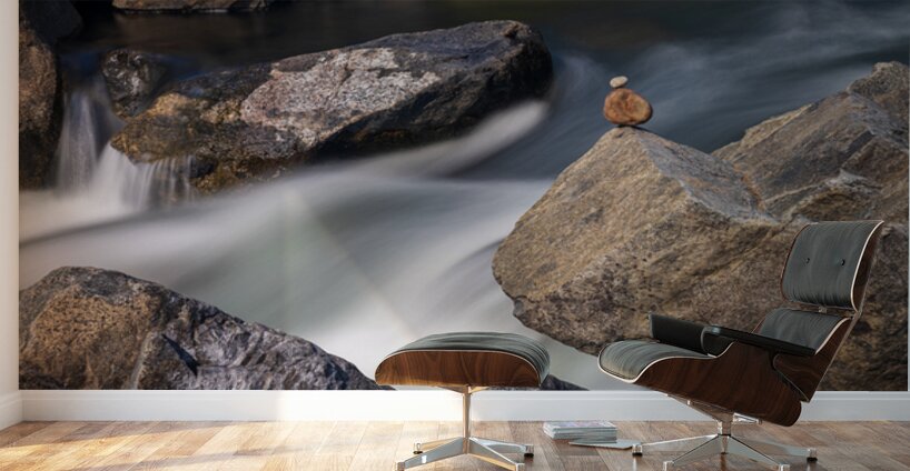 ABOUT THIS ARTWORK: PEBBLES BALANCED ON ROCKS IN RAGING RIVER ILLUSTRATING RESILIENC