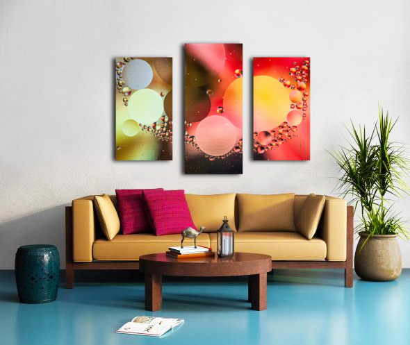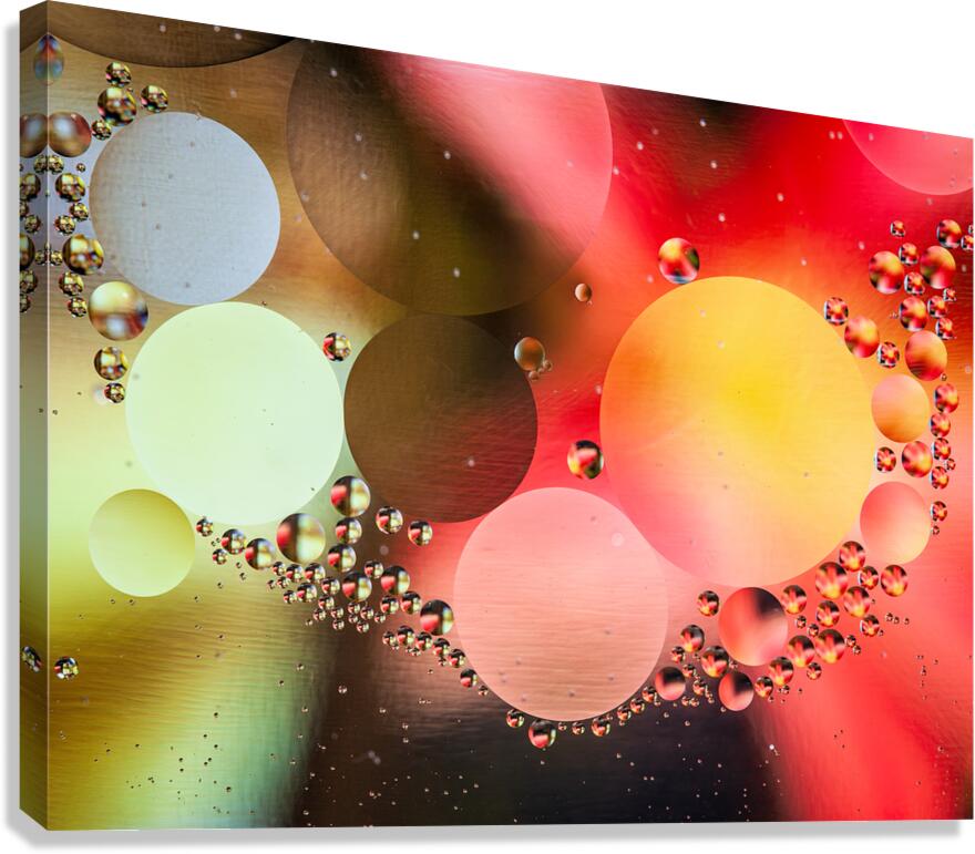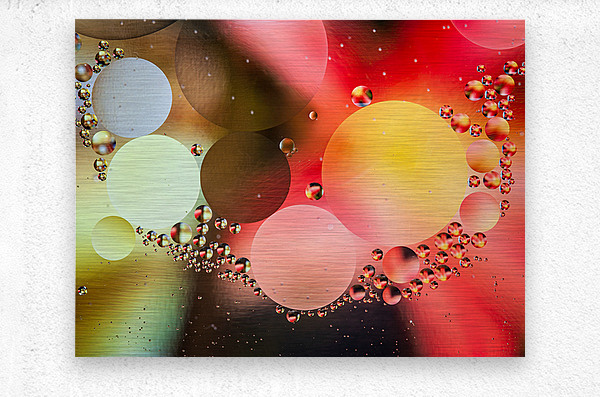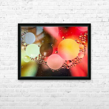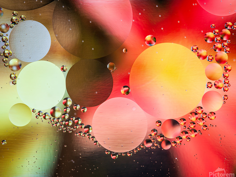 This photo features captivating bubbles and circles in vibrant colors that blend harmoniously, creating an abstract background full of life. Created from oil droplets in water that are each reflecting the color of a magazine cover placed below the water.