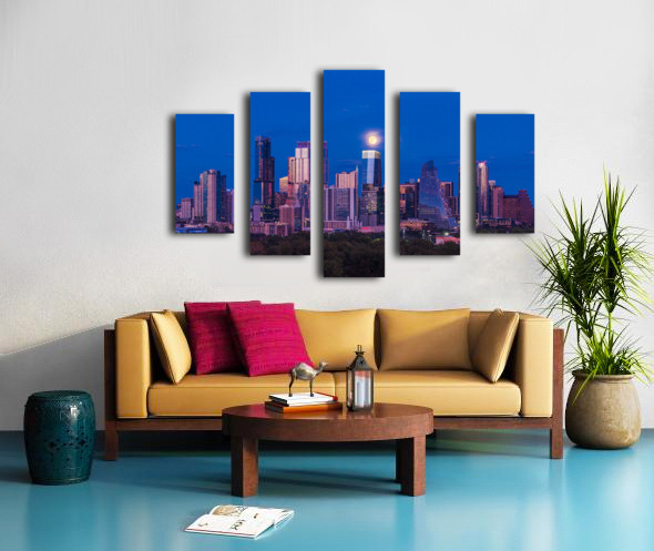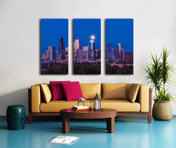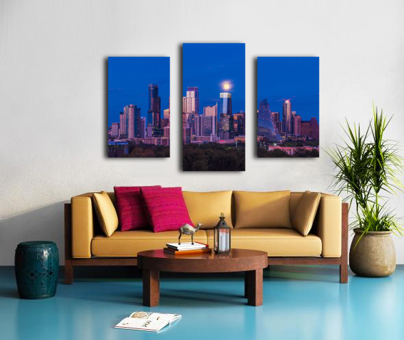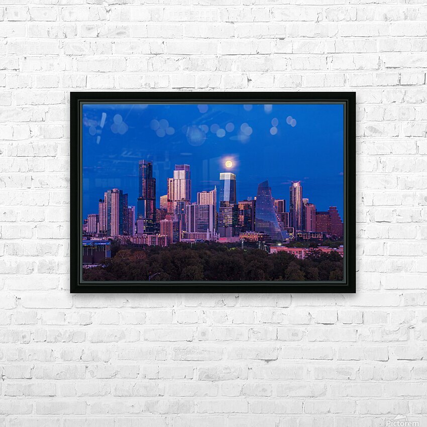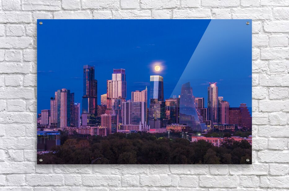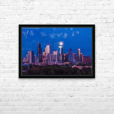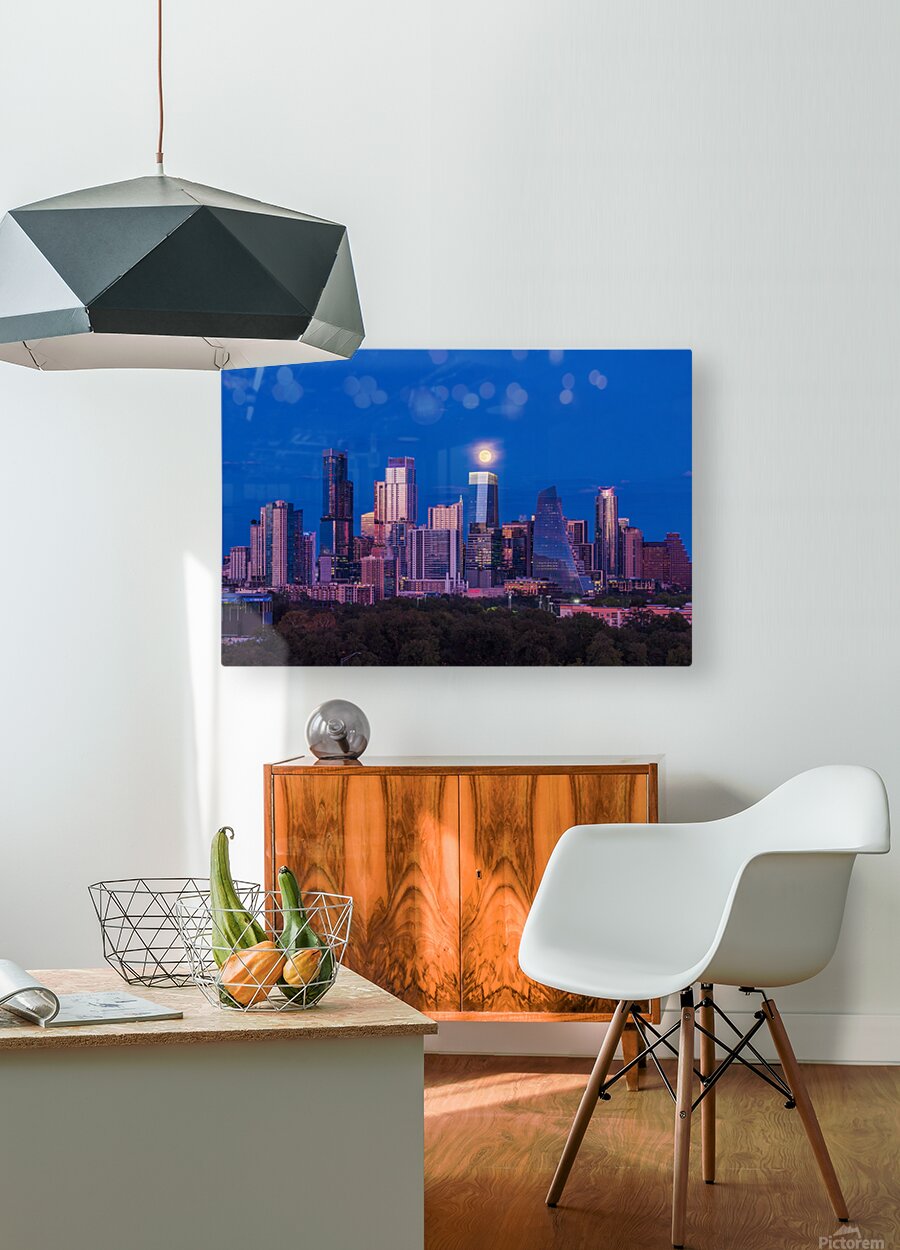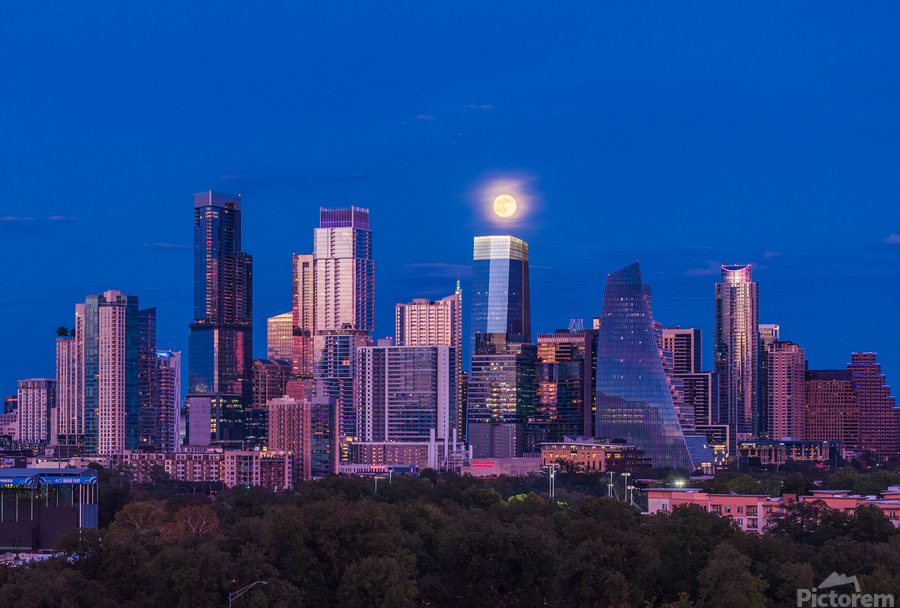 High-quality landscape and cityscape wall decor highlighting aerial view of harvest moon over Austin Texas skyline as the full harvest moon is seen rising by the office buildings. Zilker Park in the foreground.
