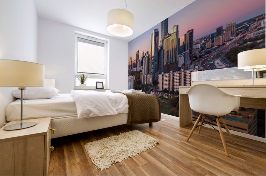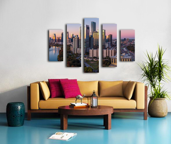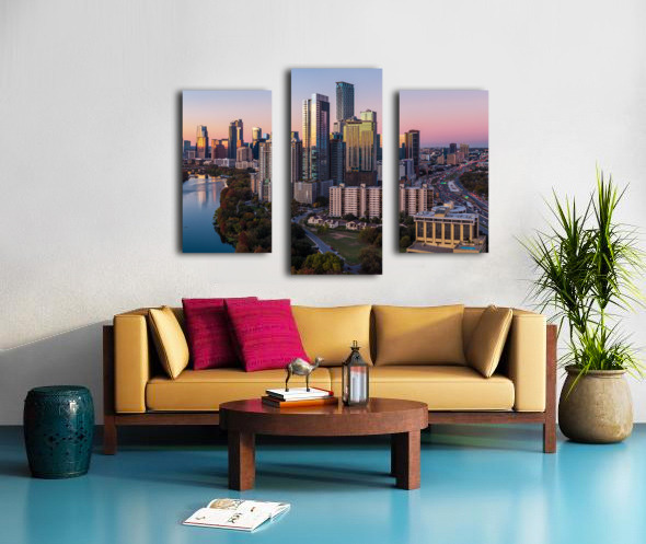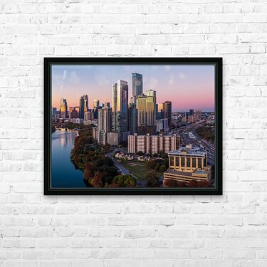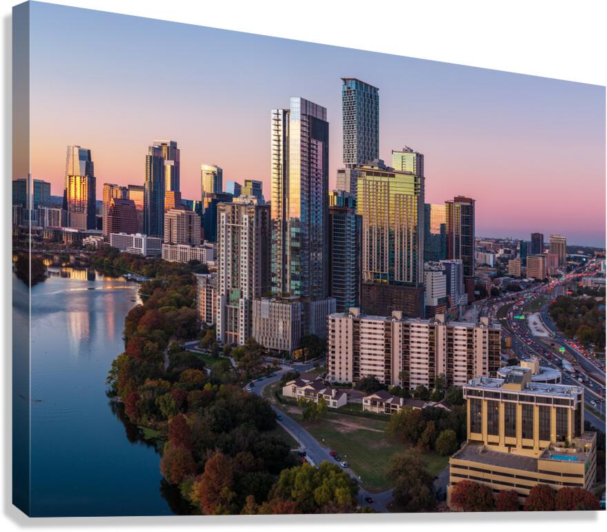 Premium high-resolution wall art print featuring aerial panoramic skyline of Austin Texas from the east at dusk or sunset in December 2025 with fall c...[+]