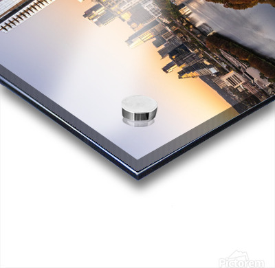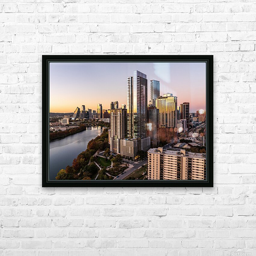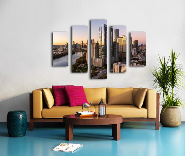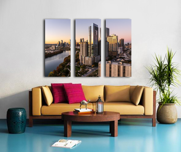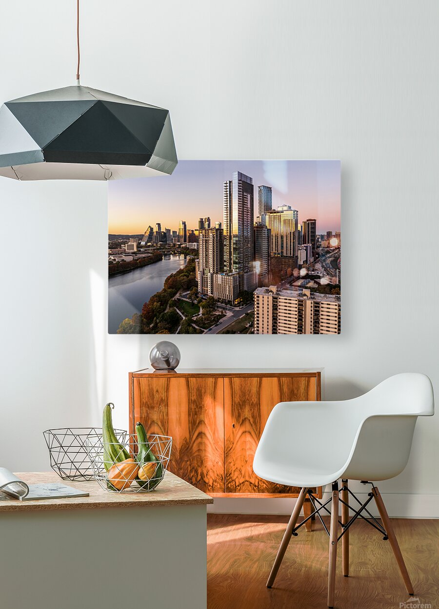 High-quality landscape and cityscape wall decor highlighting aerial panoramic skyline of downtown Austin Texas from the east at dusk or sunset in Dece...[+]