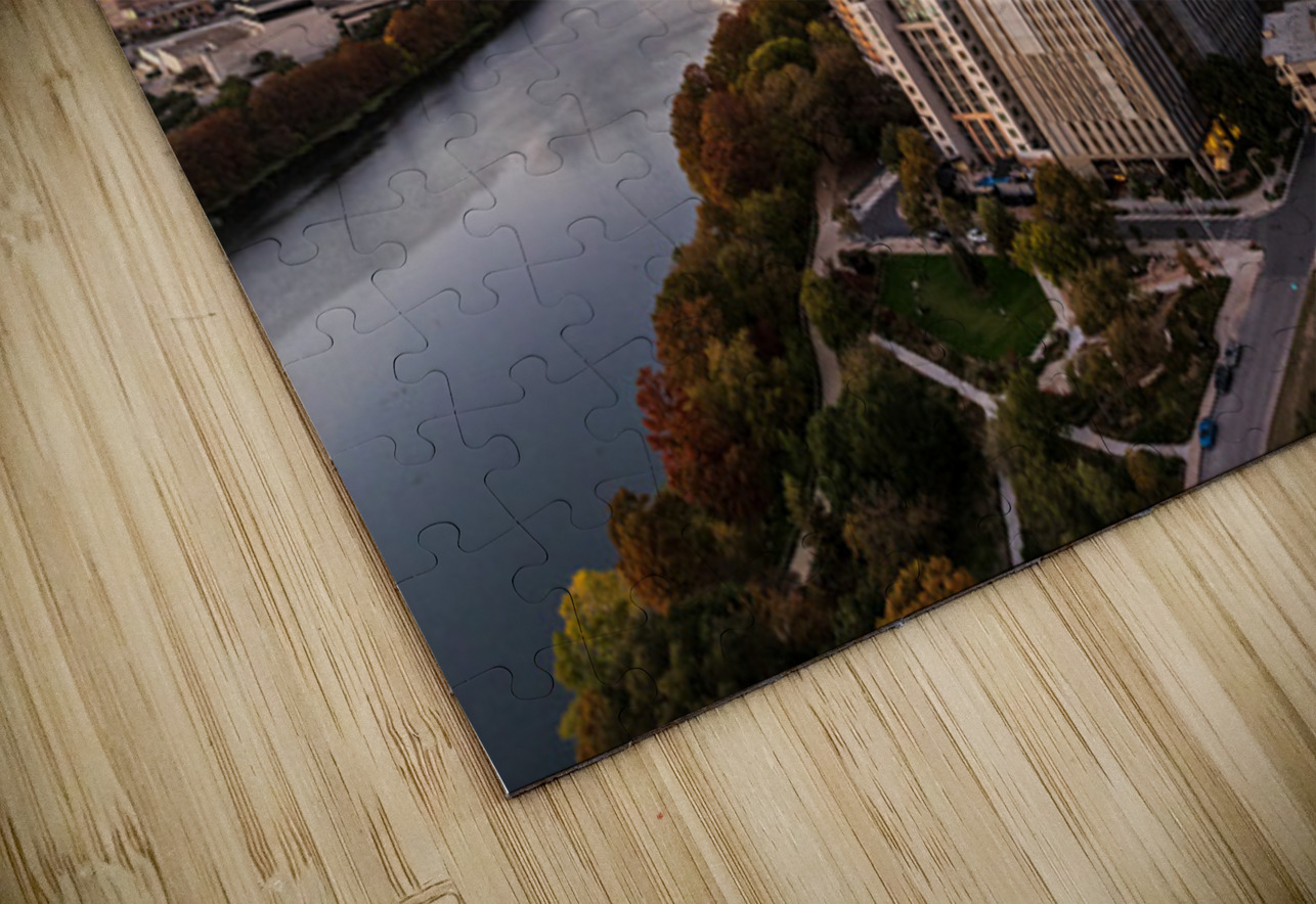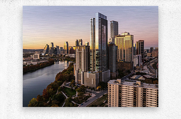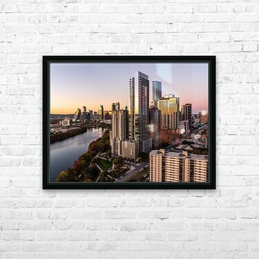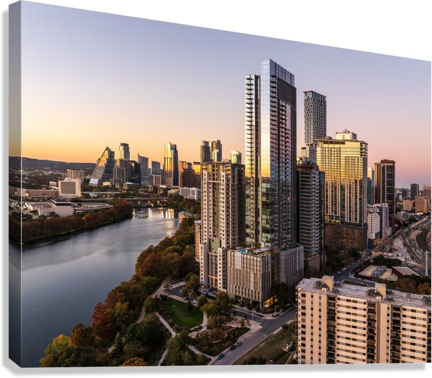 High-quality landscape and cityscape wall decor highlighting aerial panoramic skyline of downtown Austin Texas from the east at dusk or sunset in December 2025 with fall colors and clear sky
