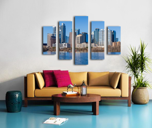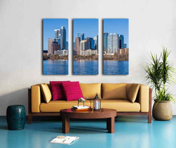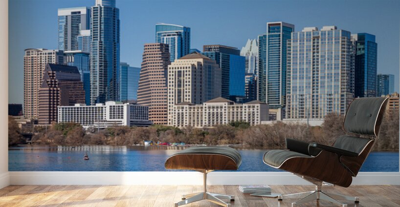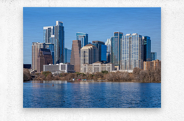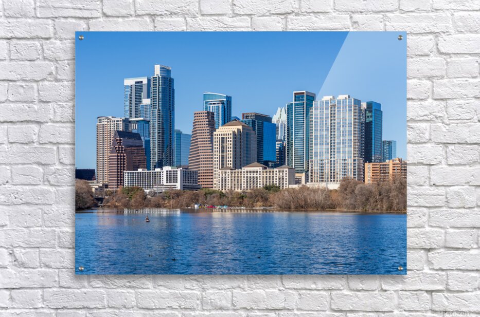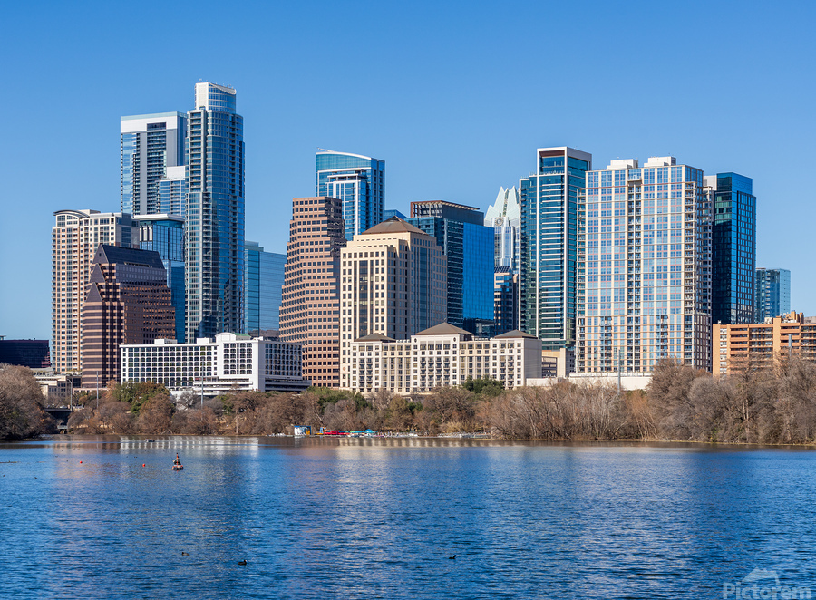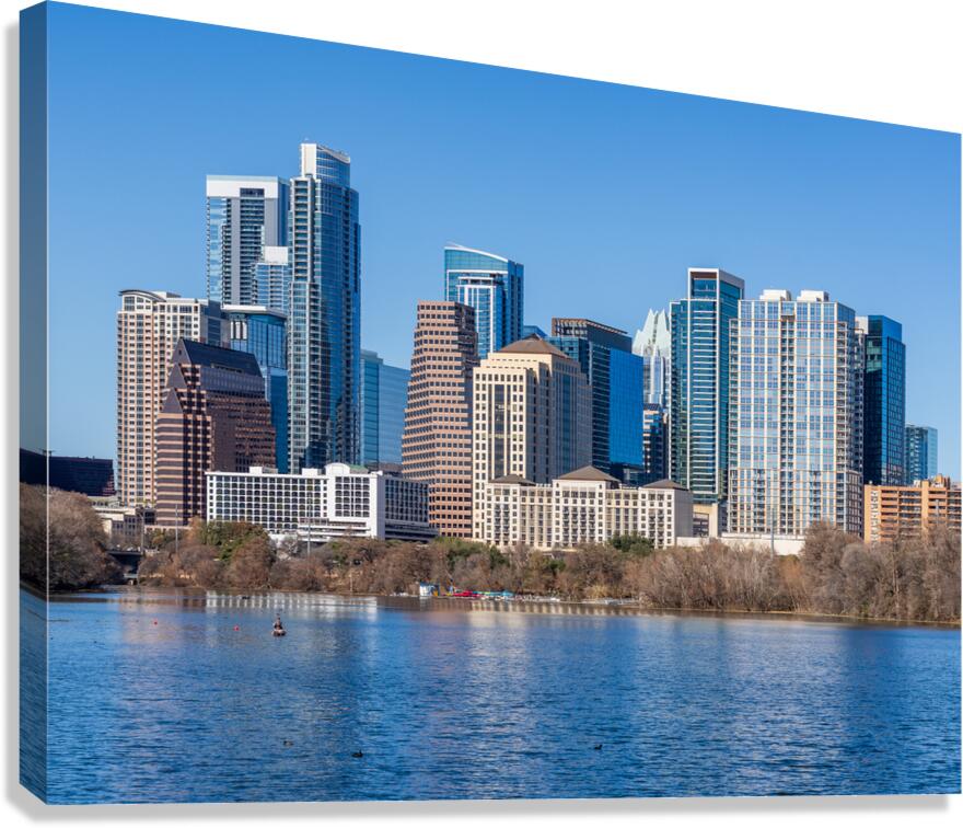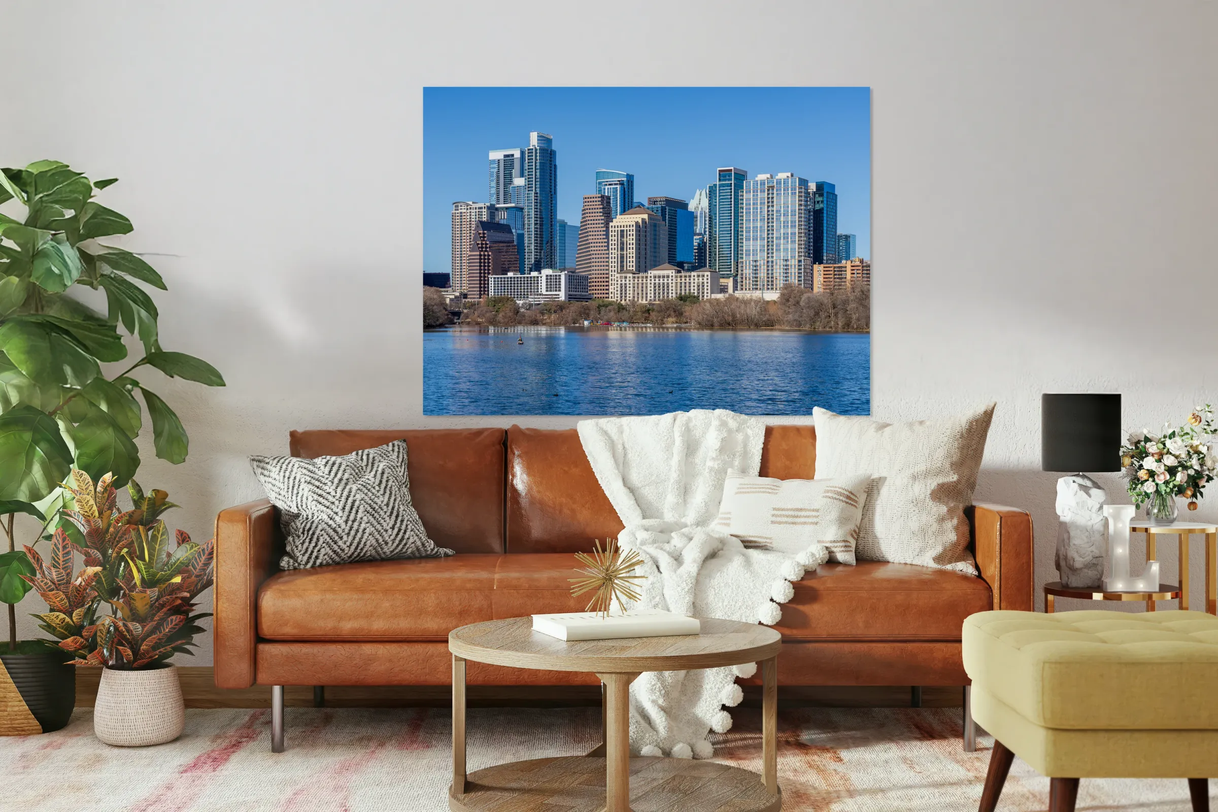 Exclusive fine art photography print ready to hang capturing city skyline of downtown Austin Texas in 2026 from across Lady Bird Lake in the winter