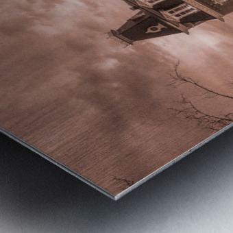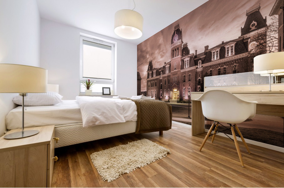Dramatic sepia image of Woodburn Hall at West Virginia University or WVU in Morgantown WV as the sun sets behind the illuminated historic building