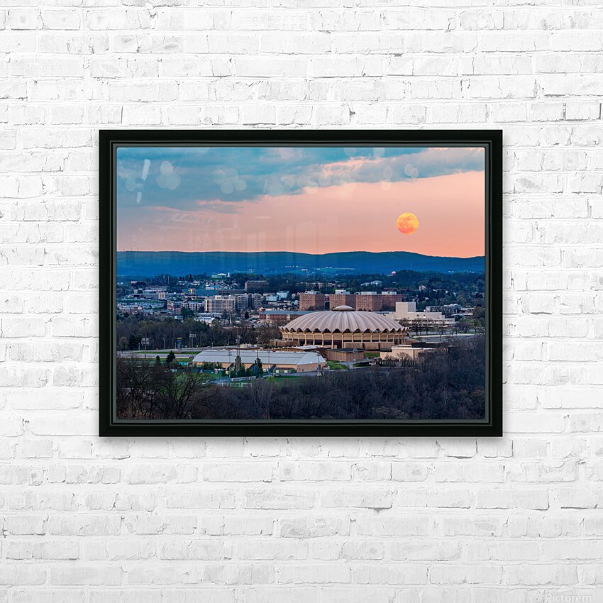 Get this artwork "Super pink moon rises above the WVU coliseum on Evansdale campus" in a framed print.