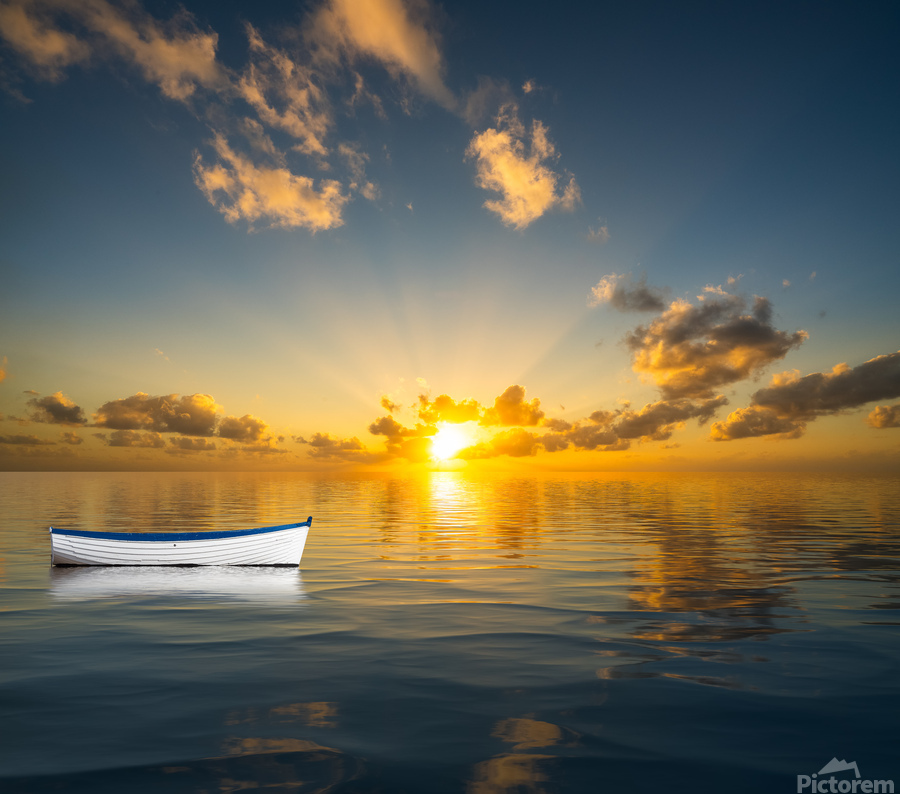 ABOUT THIS ARTWORK: WHITE ROWING BOAT ADRIFT ON OPEN OCEAN DRIFTING TO SUNSET