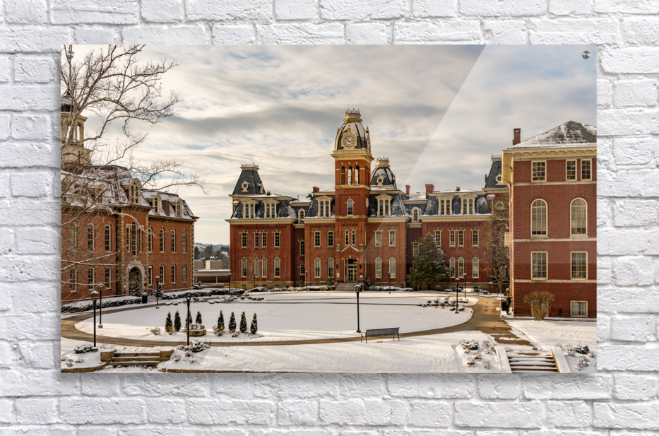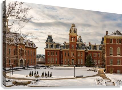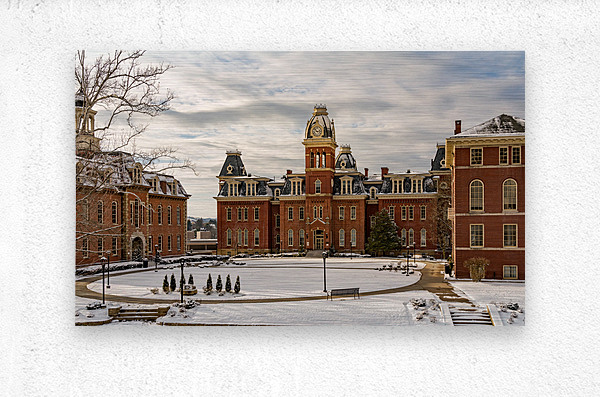 Dramatic image of Woodburn Hall at West Virginia University or WVU in Morgantown WV after a snow fall around the historic building. Perfect for a graduation gift for your student or to grace the wall of a faculty office!