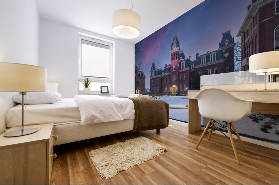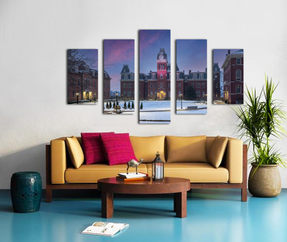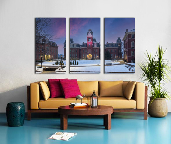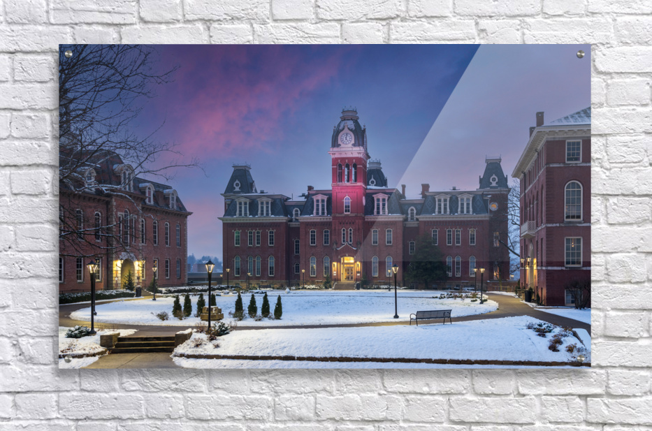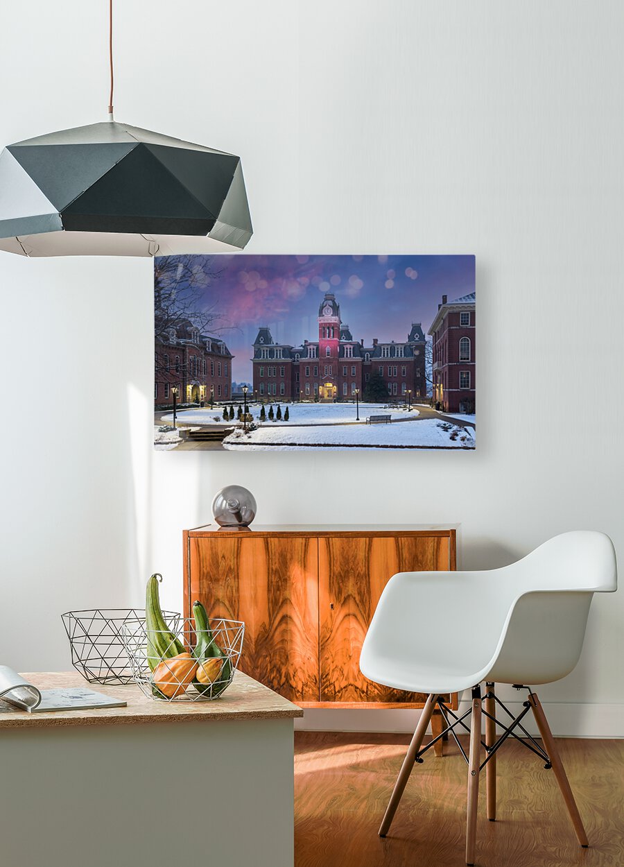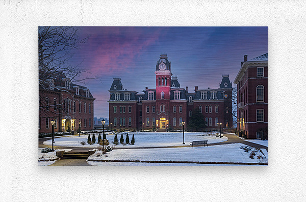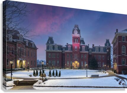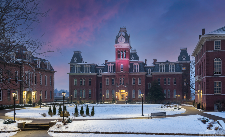 Dramatic image of Woodburn Hall at West Virginia University or WVU in Morgantown WV after a snow fall around the historic building. Perfect for a graduation gift for your student or to grace the wall of a faculty office!