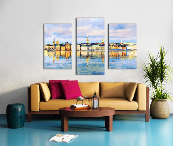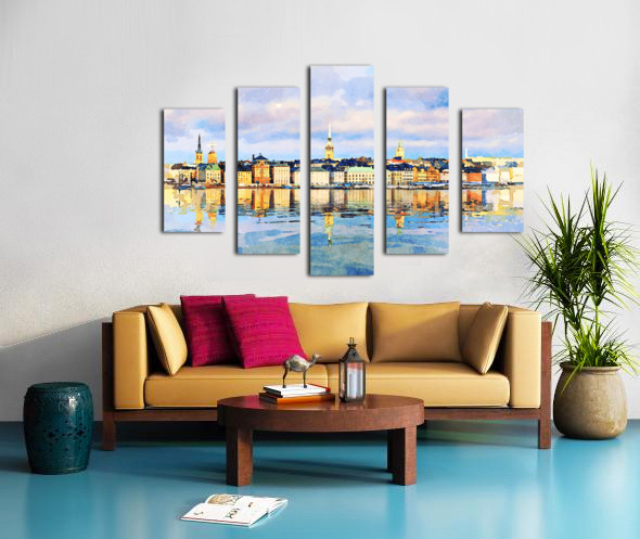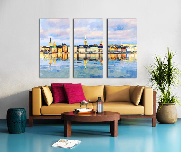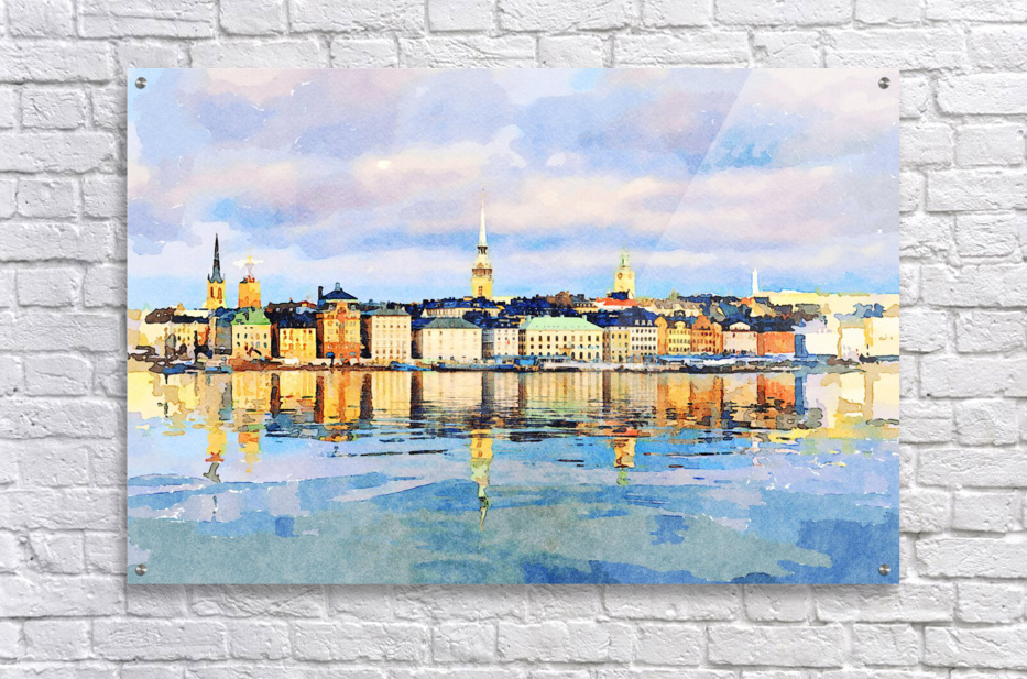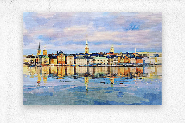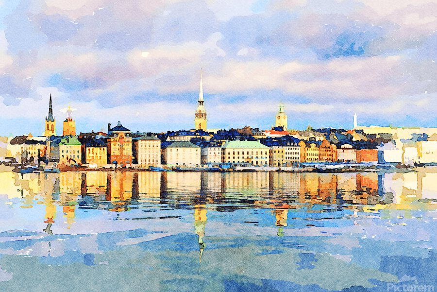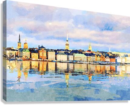 Digital water color of the panorama of Gamla Stan in Stockholm Sweden. The town dates back to 13th Century. The brightly colored city is beautiful from out in the harbor