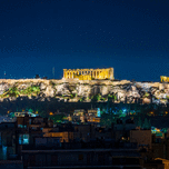 Acropolis hill at night with the city of Athens surrounding it