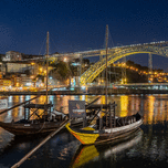 Porto Portugal - 12 August 2019: Night view of rabelo boats and cityscape of Porto from the banks of the river Douro