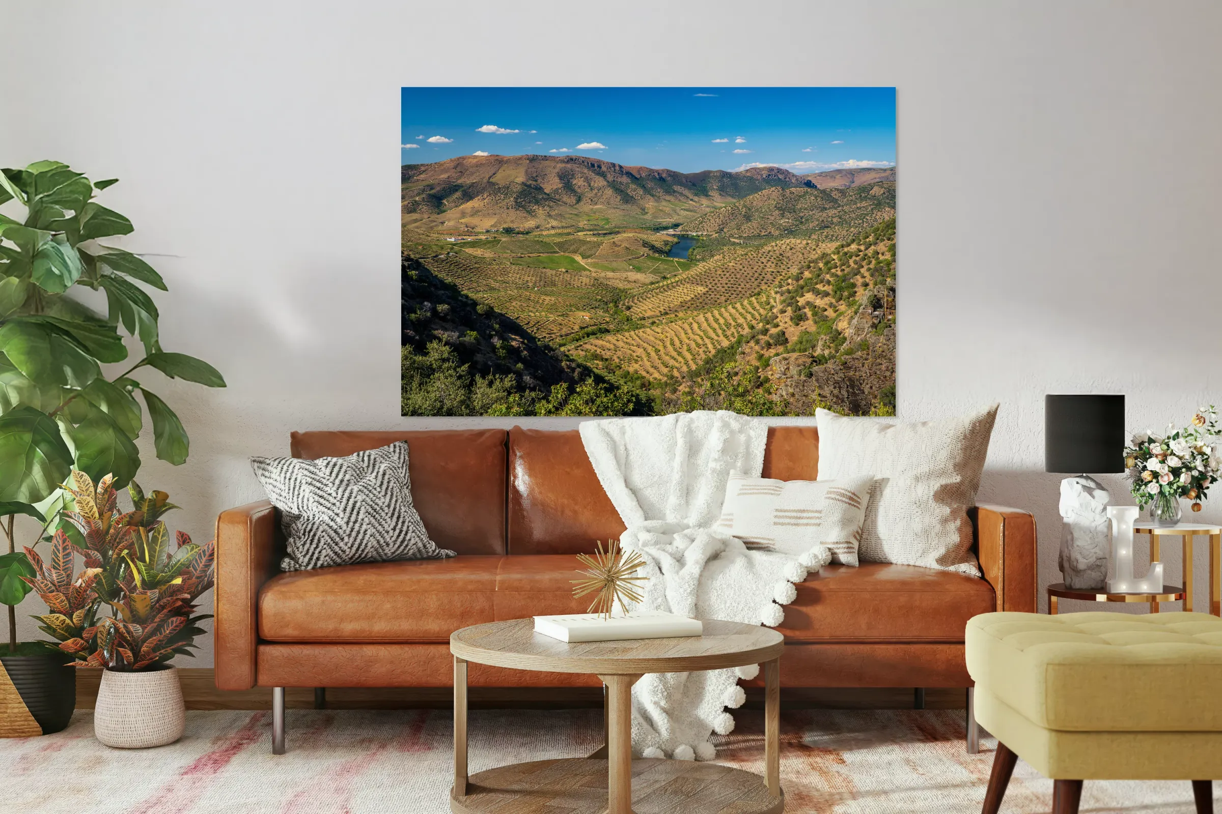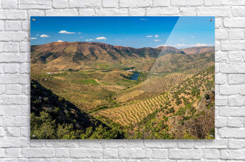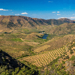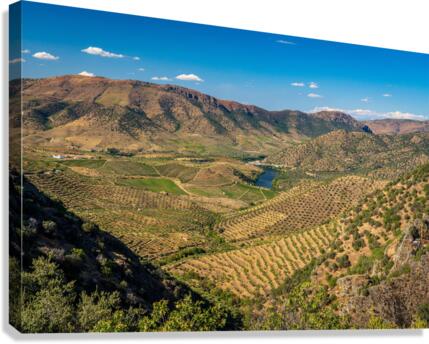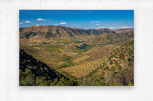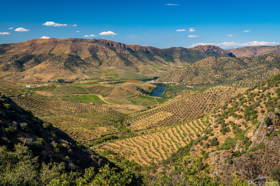 Terraces of grape vines for port wine production line the hillsides of the Douro valley at Barca de Alva in Portugal