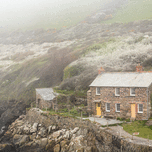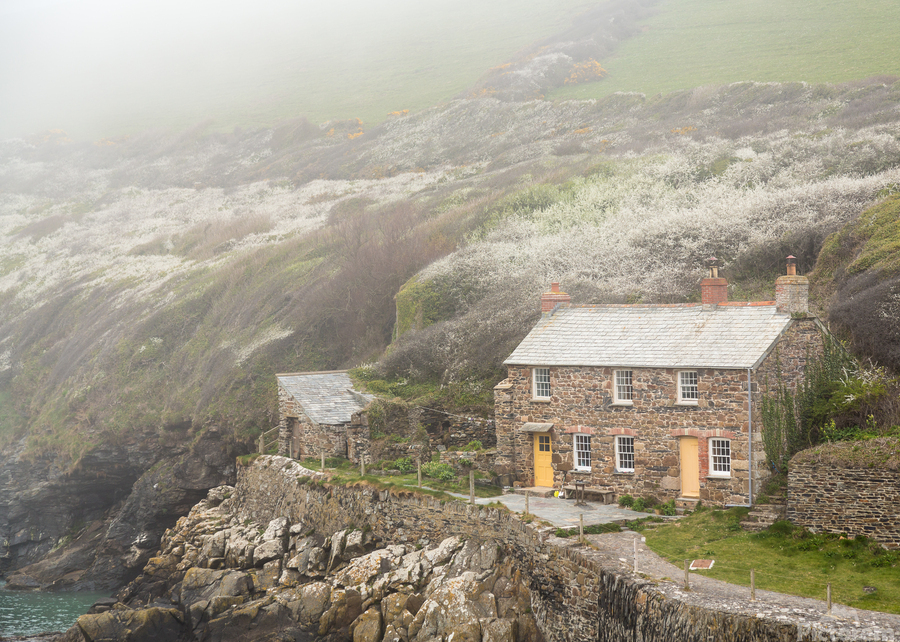 View of stone cottage and hillside as the mists roll in over the ocean in Port Quin Cornwall England UK