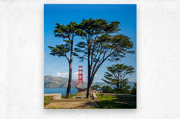 Marin Headlands with the Golden Gate Bridge taken with Cypress trees from Golden Gate park in San Francisco on clear spring day