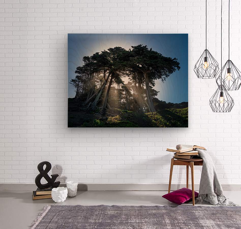 Bright sun beams stream from branches and trunks of large fir or pine trees on coast by Baker Beach San Francisco Bay in California