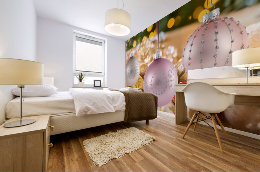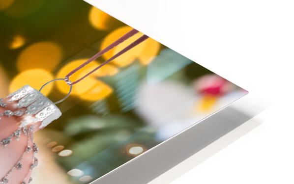 Three Christmas xmas decorations in macro hanging up in front of out of focus decorations waiting on table to be put on tree or put away