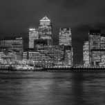 LONDON UK - JANUARY 29 2016: Night time skyline shot of the office buildings in Canary Wharf Docklands London England with black and white treatment