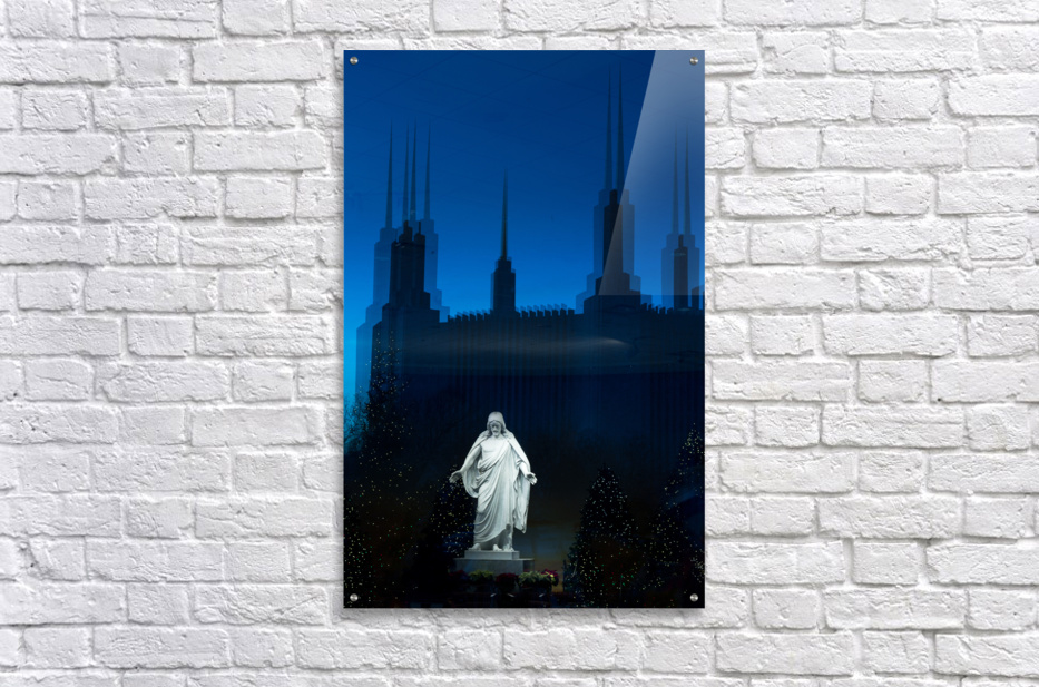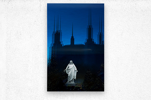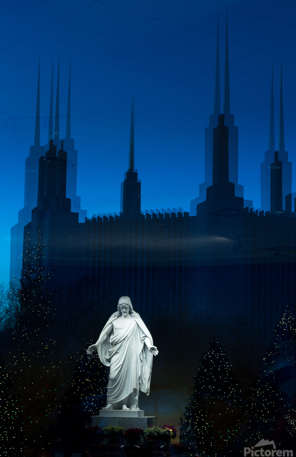 Reflection with statue of Christ at Washington DC Temple or Church of Jesus Christ of Latter-day Saints in Kensington Maryland USA