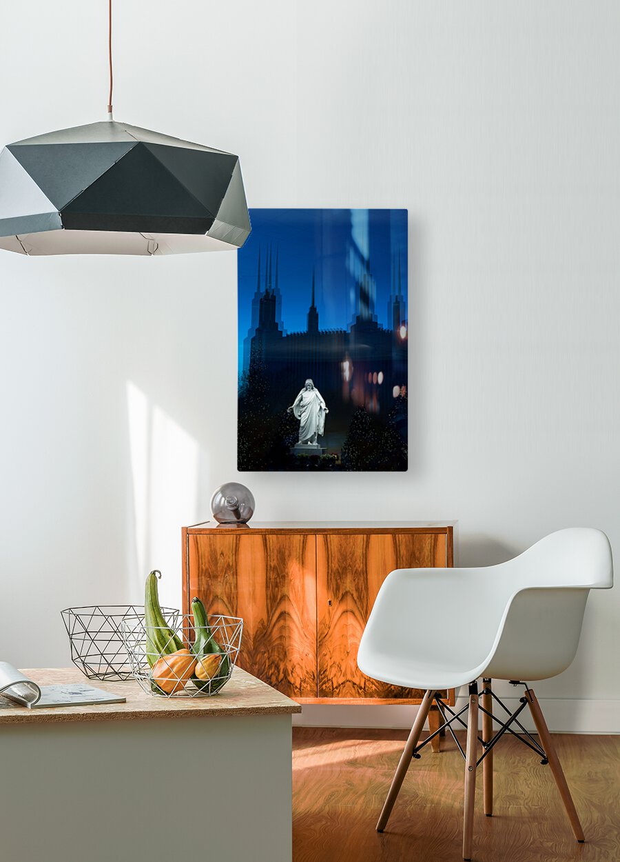 Reflection with statue of Christ at Washington DC Temple or Church of Jesus Christ of Latter-day Saints in Kensington Maryland USA